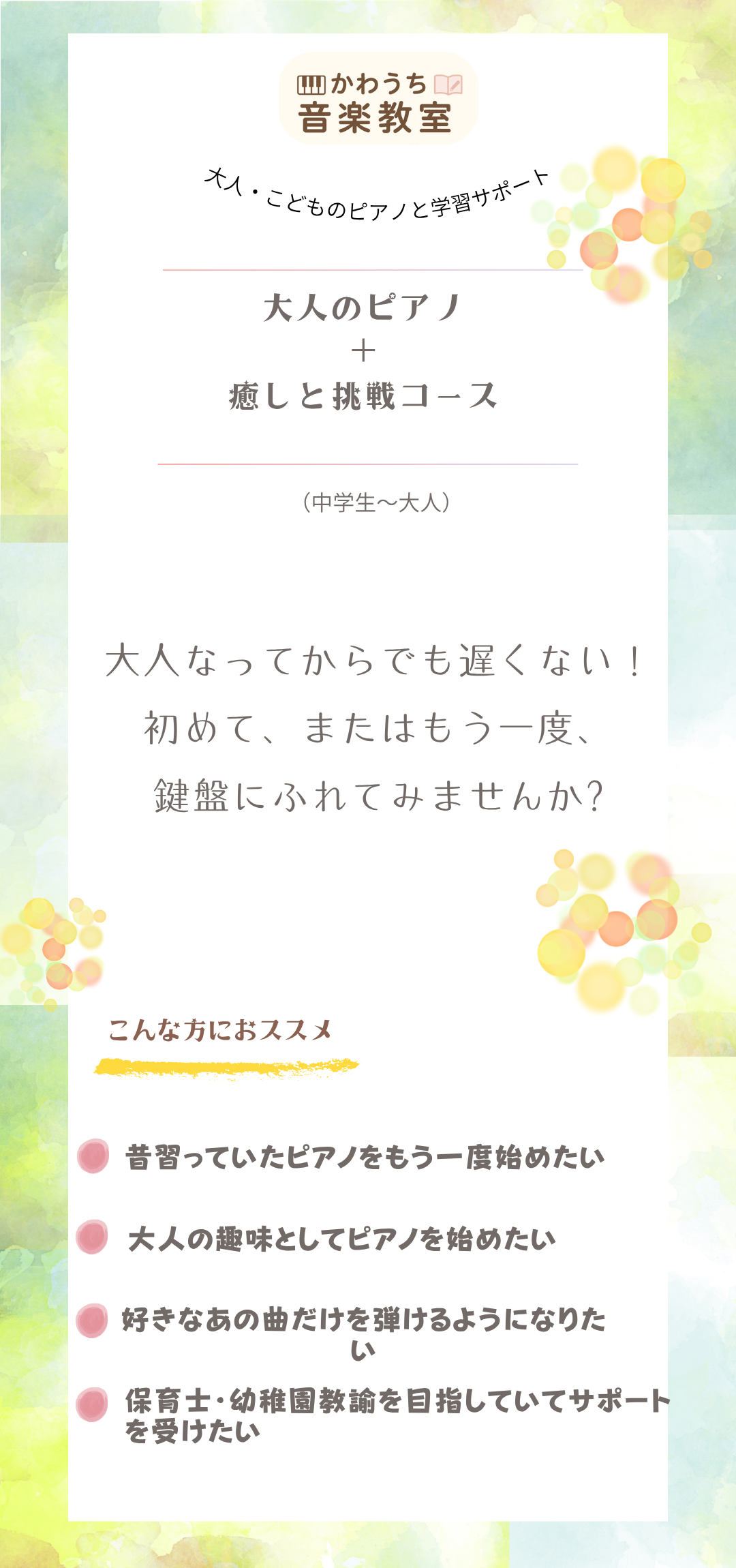 1レッスン60分を1回行った場合、 5,000円×1回=5,000円 ※大人のコースのみレッスンごとのお支払いになります |